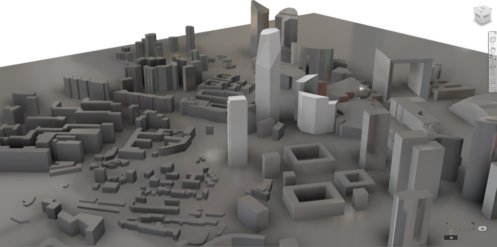 Le cas suivant est une géométrie simplifiée d’un complexe de bâtiments. Le modèle de zone urbaine traité ici était un bloc urbain réel dans la ville de La Défense, avec des bloc bâtiment encastrées les un à côté des autres et un immeuble cible de 220 m de hauteur.