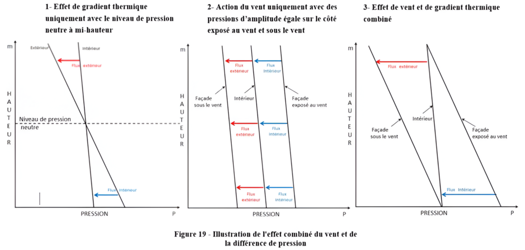Dans la plupart des cas, la ventilation naturelle (ou parasite) dépend de la force combinée des effets du vent et de cheminée. Les modèles de pression pour les bâtiments réels changent continuellement avec l’importance relative des forces thermiques et le vent. La figure ci-dessous montre l’effet combiné du vent et des forces thermiques. Les pressions dues à chaque effet sont additionnées pour déterminer la différence de pression totale à travers l’enveloppe du bâtiment.